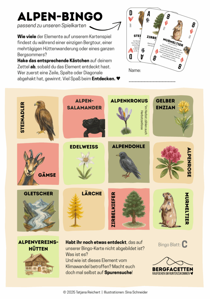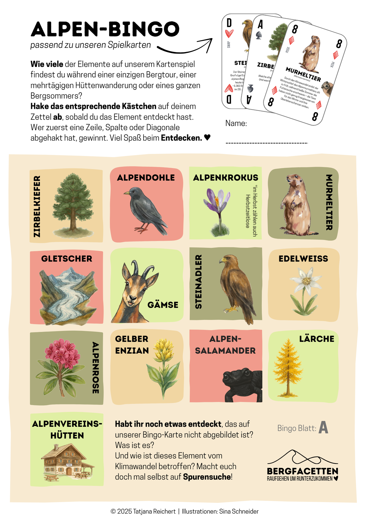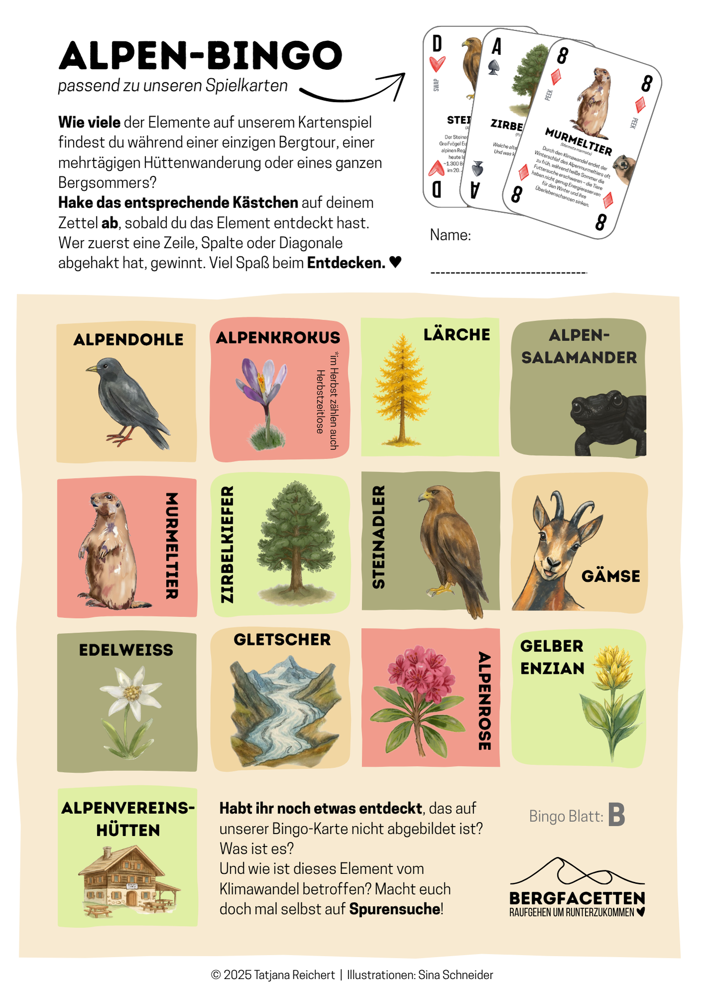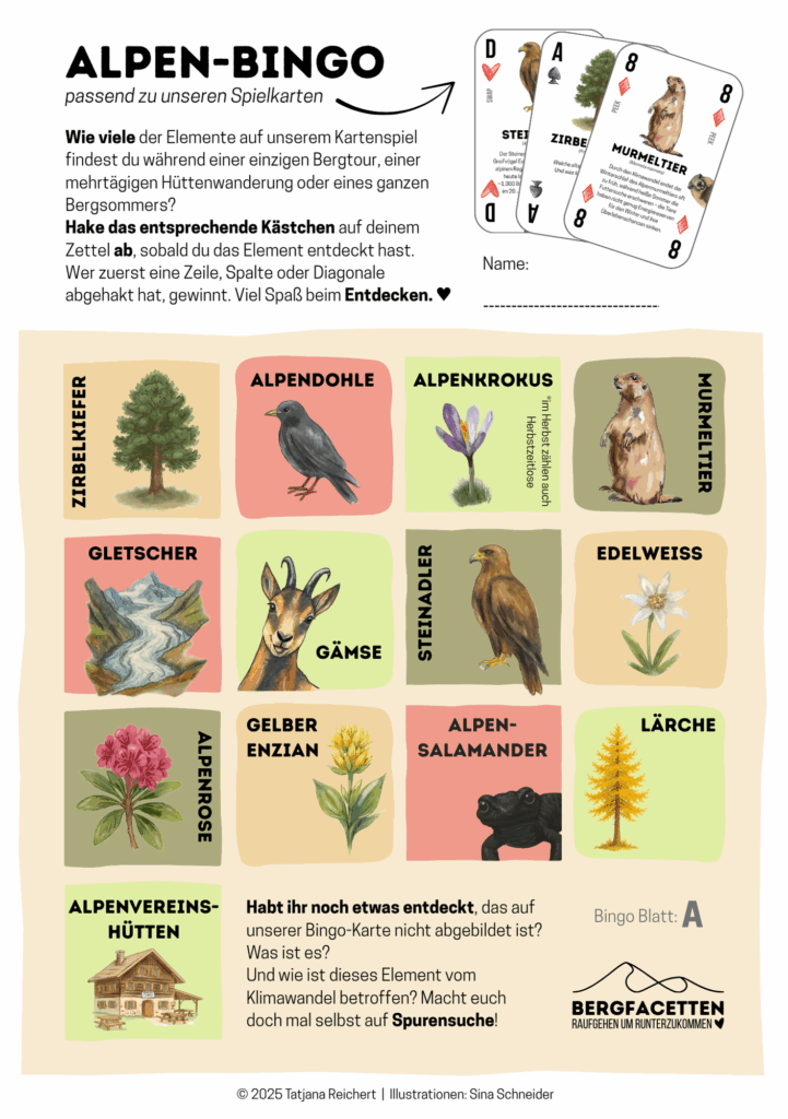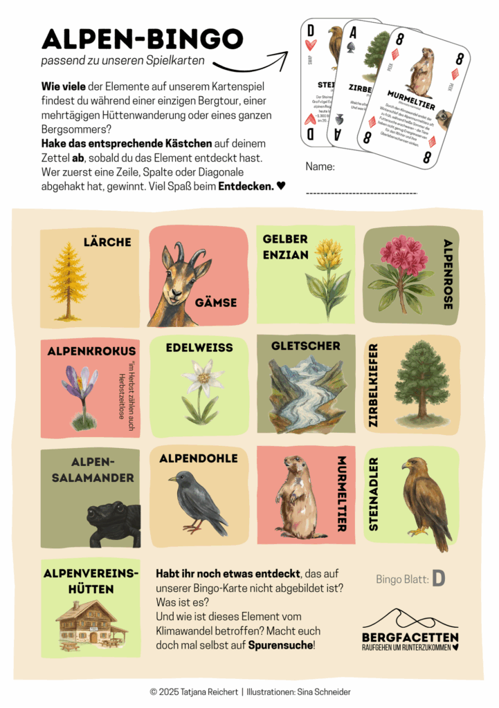 Auf diese Idee hat mich eine liebe Teilnehmerin auf einer Alpenüberquerung gebracht. „Wir haben fast alle Elemente der Spielkarten unterwegs gesehen. Eigentlich bräuchte man einen Zettel, auf dem man Tiere, Pflanzen etc. abhaken kann.“ – Gesagt, getan.