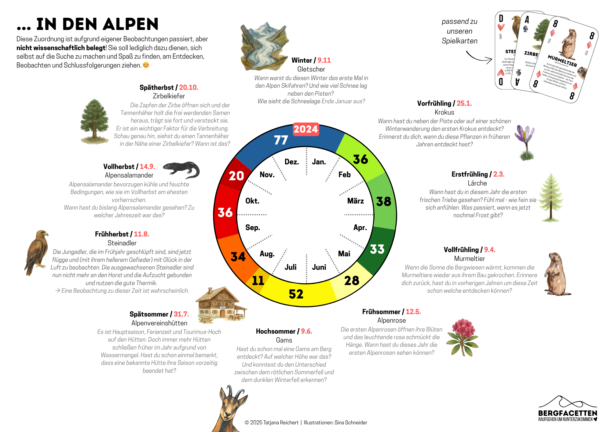 Die Auswahl und Reihenfolge der Elemente ist (natürlich 😉) nicht dem Zufall überlassen, sondern folgt den phänologischen Jahreszeiten, die ich versucht habe, auf die Alpen zu übertragen. Wenn dich das Thema interessiert, findest du weiter unten mehr Infos und eine Druckvorlage.