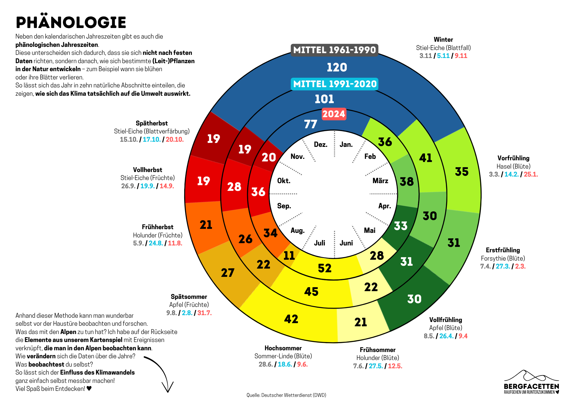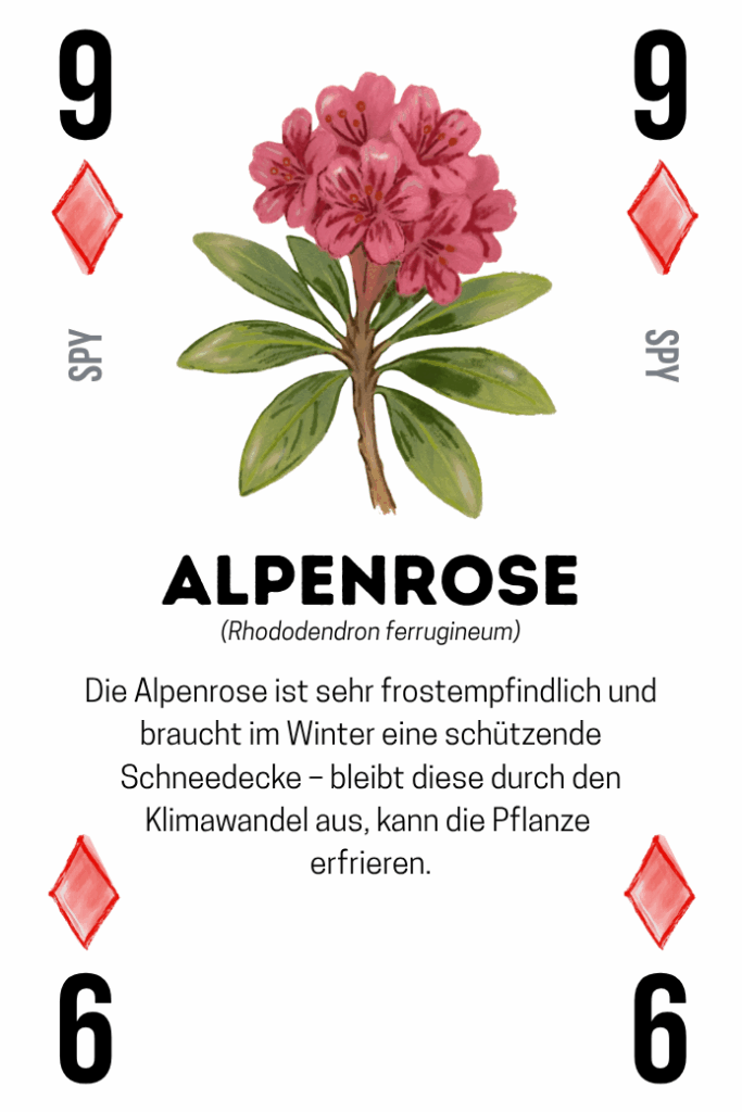 Das Konzept der Phänologie hat mich in meiner Weiterbildung zur Klimapädagogin nachhaltig beeindruckt. Anhand von Zahlen und Fakten belegen zu können, dass sich in der Natur etwas verändert, das mit unseren (bewussten und unbewussten) Wahrnehmungen übereinstimmt, finde ich großartig! So habe ich mir im Rahmen meiner Zertifizierungsarbeit Gedanken darüber gemacht, wie sich dieses Konzept auf unsere Beobachtungen in den Alpen übertragen lässt. Mithilfe der Spielkarten 5 bis Ass lässt sich ein phänologisches Jahr legen. Weitere Infos und Details zu den Elementen hälst du in dieser Übersicht (A4) zum Download: